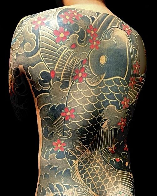 昇龍・桜花・牡丹散らし(額彫り)の刺青、和彫り(Japanese Tattoo・タトゥー)の画像